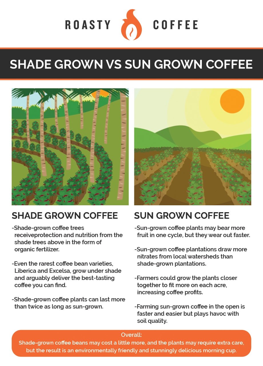 Cà phê giống như bất kỳ loại cây nào, cần ánh sáng để duy trì sự sống. Ánh sáng ngoài việc tham gia vào quá trình quang hợp, đối với cà phê nó còn đóng vai trò sinh trưởng của cây. Cụ thể, khi cây cà phê tiếp xúc với mức độ ánh sáng thấp, nó tạo ra ít hoa hơn so với khi tiếp xúc với mức độ ánh sáng cao hơn. Với nhiều hoa hơn, cây cho nhiều trái cây và nhiều hạt hơn. Do đó, trồng cà phê với ánh sáng trực tiếp cho năng suất cao hơn so với trồng dưới bóng râm.
