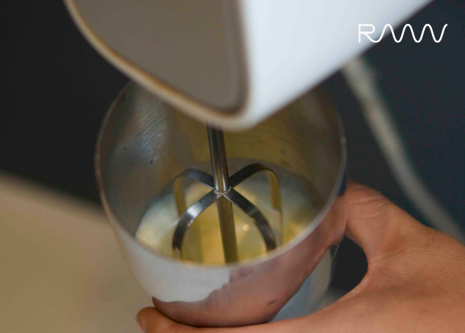 => Rồi hãy sử dụng máy đánh trứng hay máy đánh cầm tay để đánh bông lên và đổ lên trên lớp cà phê.