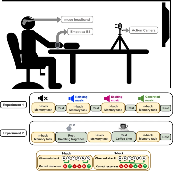 Trong quá trình thử nghiệm, những người tham gia sẽ đeo vòng đeo tay theo dõi da và băng đô theo dõi não trong khi trải qua cái được gọi là thử nghiệm n-back. Trong thử nghiệm nhận thức này, những người tham gia được đưa ra một chuỗi âm thanh hoặc hình ảnh và sau đó được yêu cầu nêu vị trí của kích thích hiện tại giống với vị trí được đưa ra một số cho trước trong chuỗi. Đối với thử nghiệm 3-back, đó sẽ là ba vị trí trước trong chuỗi; đối với thử nghiệm 5-back, đó sẽ là năm vị trí, v.v. Những người tham gia được đưa ra thử nghiệm n-back làm cơ sở, trước khi uống cà phê hoặc nghe nhạc hoặc ngửi nước hoa, một điều thứ ba mà họ cũng đã thử nghiệm.