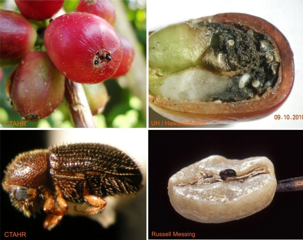 chúng chui vào quả cà phê khi còn non, đào sâu vào bên trong để sinh sản. Sau đó con non thường trồi lên từ phía bên kia, tạo ra một hạt sâu có hai lỗ trên đó. Tỷ lệ mắc bệnh Berry Borer có xu hướng giảm khi độ cao tăng lên. Nhân bị sâu đục nếu hiện diện với số lương lớn sẽ gây ra vị chua, mốc hoặc khét.