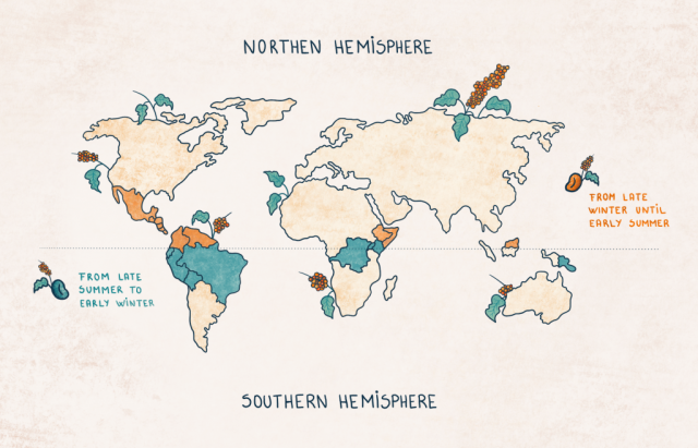 Đầu tiên, bạn đọc cần nắm bắt được khái niệm về ‘mùa màng’ và thu hoạch của cà phê. Trong thực tế, hạt cà phê là nhân của quả cà phê mọc trên cây, và nó là một sản phẩm của nông nghiệp. Do đó, ở mỗi vùng đất (hay mỗi quốc gia) khác nhau, khí hậu và thổ nhưỡng khác nhau, những giống cây trồng và đặc tính canh tác khác nhau, sẽ cho ra thời điểm thu hoạch khác nhau. Thời tiết của địa phương gieo trồng cũng là một nhân tố khiến cho quá trình đơm hoa, kết trái và chín của cây cà phê khác nhau. Như vậy, ở mỗi thời điểm trong năm, mỗi quốc gia sẽ có mùa thu hoạch cà phê trùng nhau hoặc khác nhau tùy vào vùng lãnh thổ.