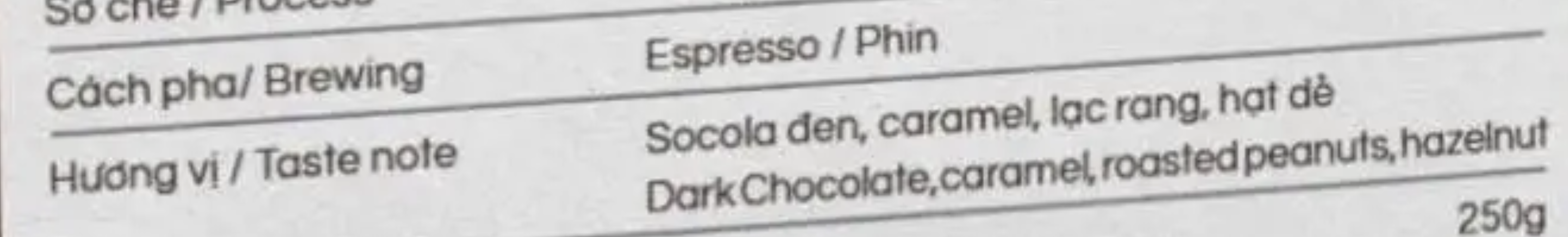 Sơ chế (Processing). Đây là thông tin giúp bạn biết loại hạt cà phê này được sơ chế như thế nào sau khi thu hoạch. Ở những đất nước lượng mưa ít, ví dụ như Panama, người trồng cà phê thường phải sơ chế bằng cách phơi khô, còn được gọi bằng nhiều cái tên như sun-dried, natural process, honey process (thậm chí còn black honey, yellow honey .v.v..). Ngược lại, ở những vùng mưa nhiều như Kenya, Ethiopia, Indonesia… thì các trang trại (coffee farm) thường xử lý bằng cách sử dụng nước để ngâm và lên men hạt cà phê. Cách này còn được gọi là wet process, wash, fully wash, semi-wash (tùy thuộc vào thời gian cà phê ngâm trong nước 48 giờ, 72 giờ hoặc lâu hơn).