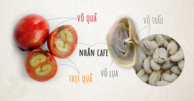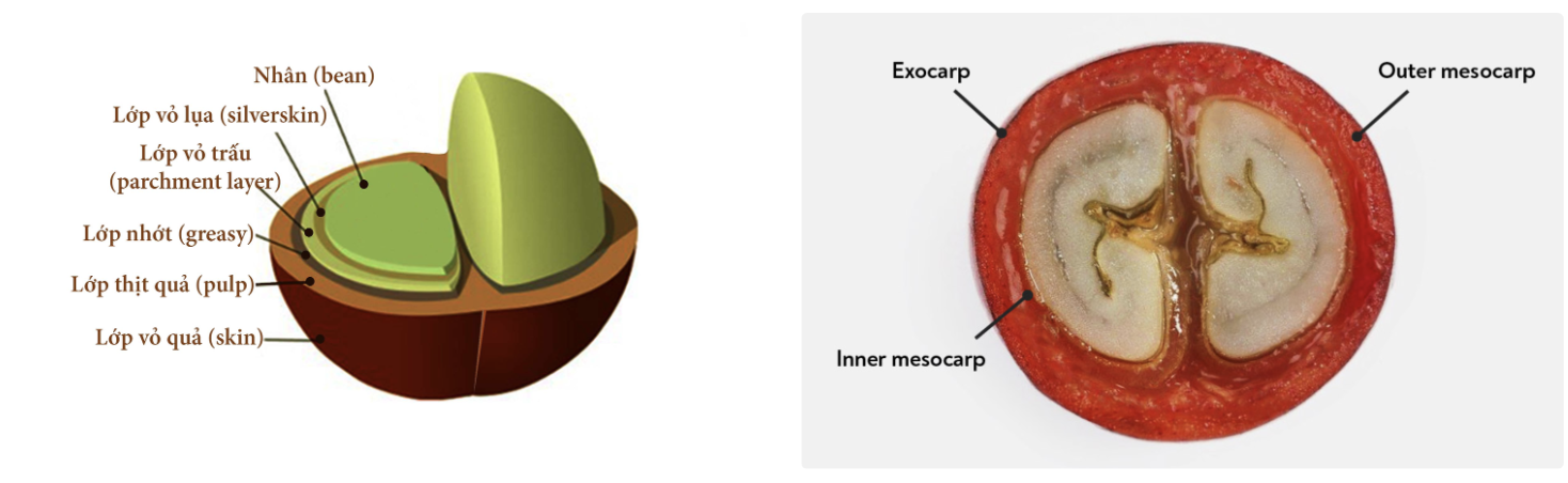 Phần hạt: Bao gồm Lớp nhầy (Greasy); vỏ trấu (Parchment); Vỏ lụa (Silverskin) và Nhân