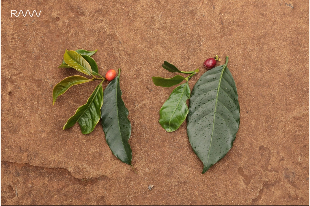 Ở hai tấm ảnh bên trên, bên trái chính là Typica với trái cherry có núm bò bé và nhô ra, đi kèm là những tấm là dài có phần hơi gấp và cứng. Lá non có phần giống là xoài