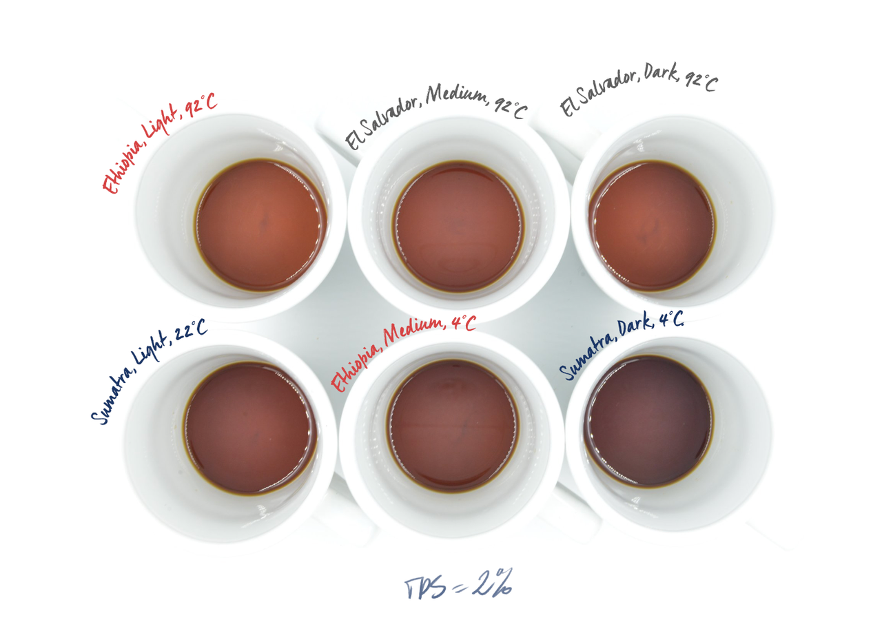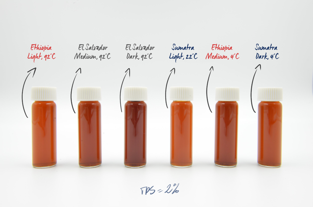 Thực nghiệm đã chứng minh màu sắc của chiết xuất cà phê bị ảnh hưởng mạnh mẽ không chỉ bởi mức độ rang mà còn bởi nhiệt độ pha cà phê, đặc biệt là ở chế độ rang nhẹ hoặc vừa. Theo trực giác, điều này khá dễ hiểu, vì mức độ rang tăng lên sẽ làm cho hạt cà phê sẫm màu hơn, sau đó có thể dẫn đến chiết xuất có màu đậm hơn. Điều đáng chú ý là việc sử dụng nhiệt độ pha “lạnh” (4 hoặc 22°C) dẫn đến đồ uống có màu đỏ hơn nhiều so với màu nâu đen điển hình của cà phê pha nóng (92°C). Nói cách khác, màu sắc của bột cà phê không được chuyển trực tiếp vào nước và màu sắc của nước pha sẽ thay đổi đáng kể dựa trên nhiệt độ của nước pha, điều này làm phức tạp việc lựa chọn cà phê và các thông số chiết xuất để đạt được cà phê pha có màu sắc mong muốn.