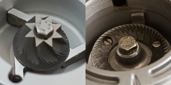 Mặt khác, lưỡi phẳng phải đẩy cà phê sang hai bên. Điều này có nghĩa là nó phải dựa vào lực quán tính/lực ly tâm khi xay để đẩy hạt ra ngoài.