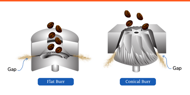 Mũi khoan phẳng không chỉ có ít răng lớn hơn mà còn có diện tích bề mặt ít hơn so với mũi khoan hình nón có kích thước tương tự. Cà phê đi qua lưỡi xay hình nón sẽ được nghiền trên nhiều bề mặt hơn so với lưỡi xay phẳng, cần ít năng lượng và thời gian hơn để thực hiện cùng một lượng công việc.
