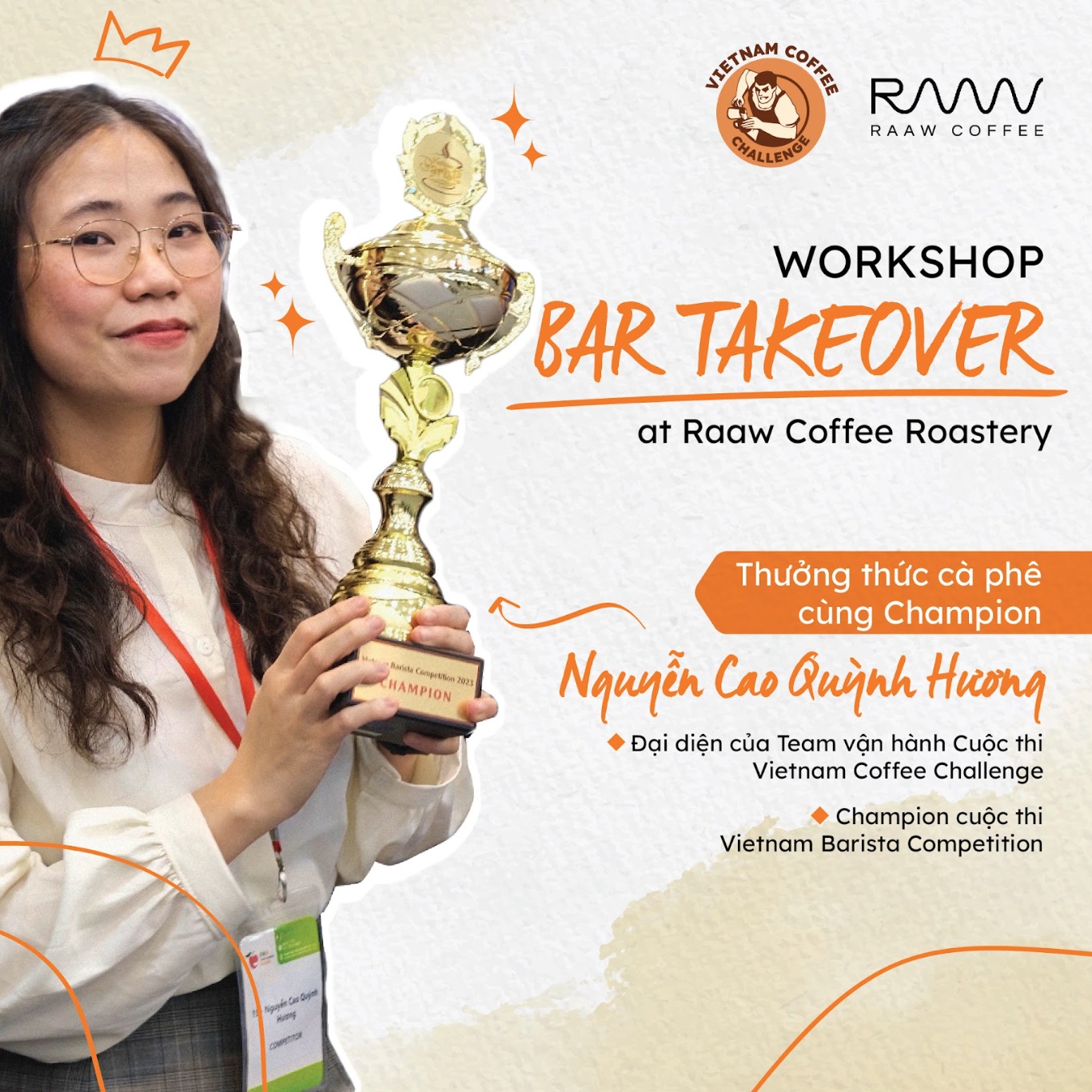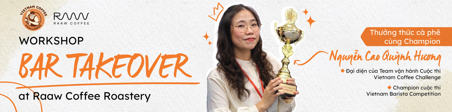 💥 Tháng 1/2024, VCC & Raaw sẽ tổ chức cho các bạn Coffee Lover Hà Thành buổi Workshop “Thưởng thức cà phê cùng Champion”. Tại buổi Workshop các bạn sẽ có cơ hội trao đổi kinh nghiệm thi đấu và thưởng thức các món nước trong cuộc thi Vietnam Barista Competition 2023 được pha chế bởi Champion Ms. Nguyễn Cao Quỳnh Hương - đồng thời cũng là Đại diện team vận hành Cuộc thi Vietnam Coffee Challenge (VCC).