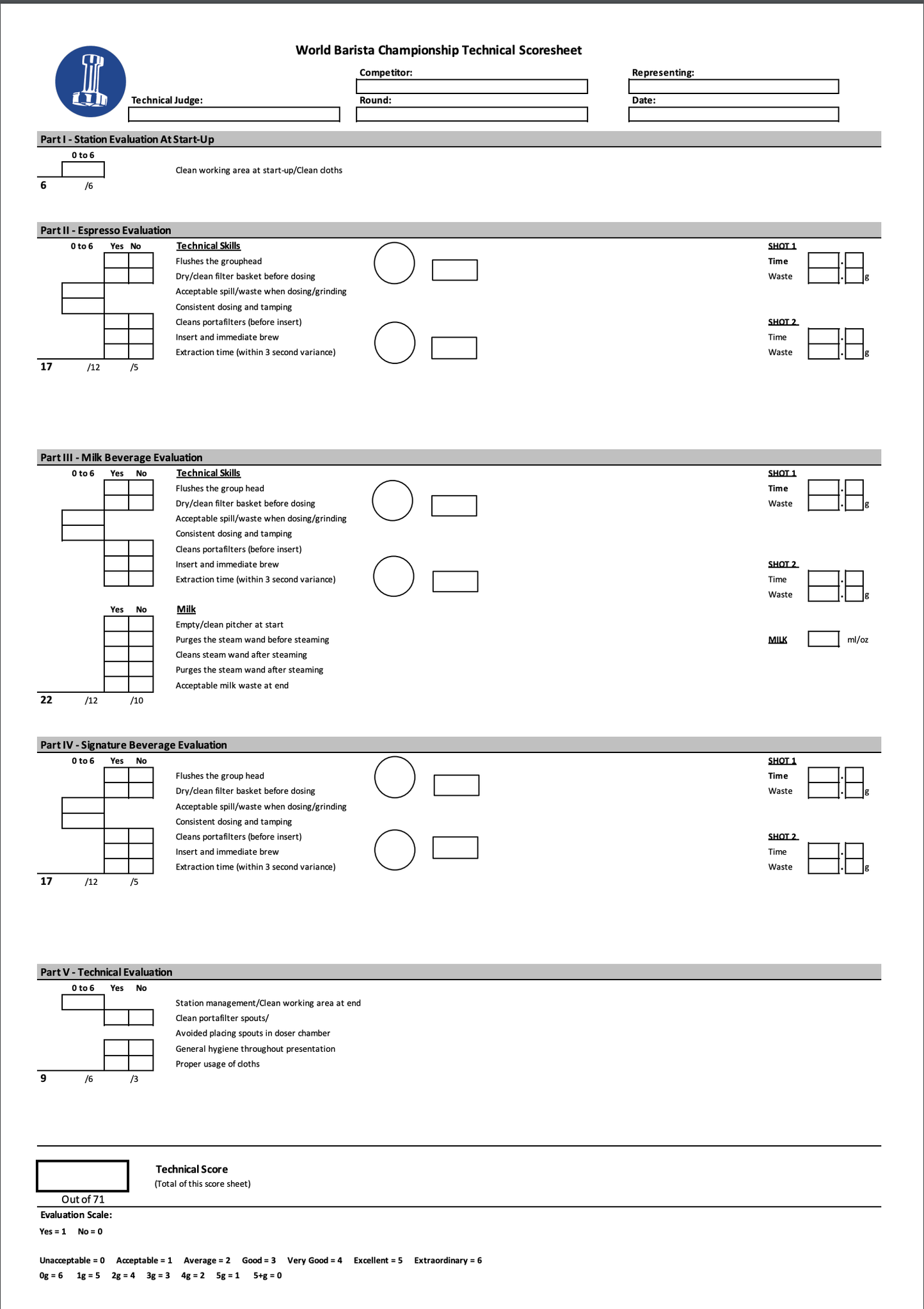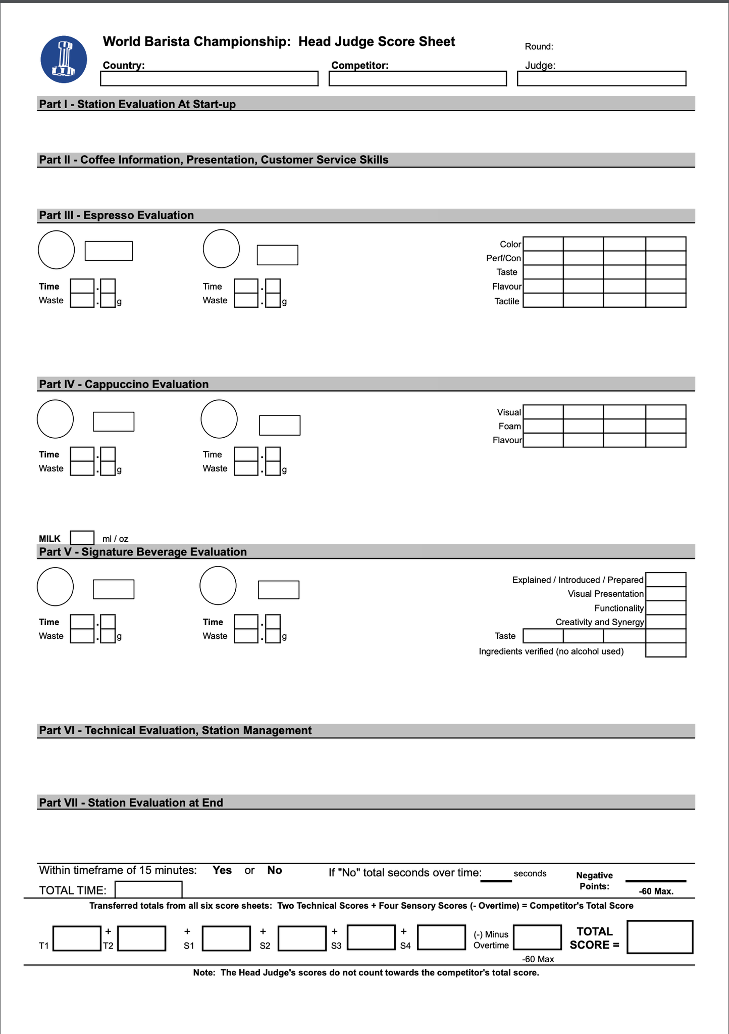 Ở đấy sẽ có 3 bảng điểm: Bảng điểm thử nếm (Sensory Score Sheet); Bảng điểm kỹ thuật (Technical) và Bảng điểm của Giám khảo trưởng.