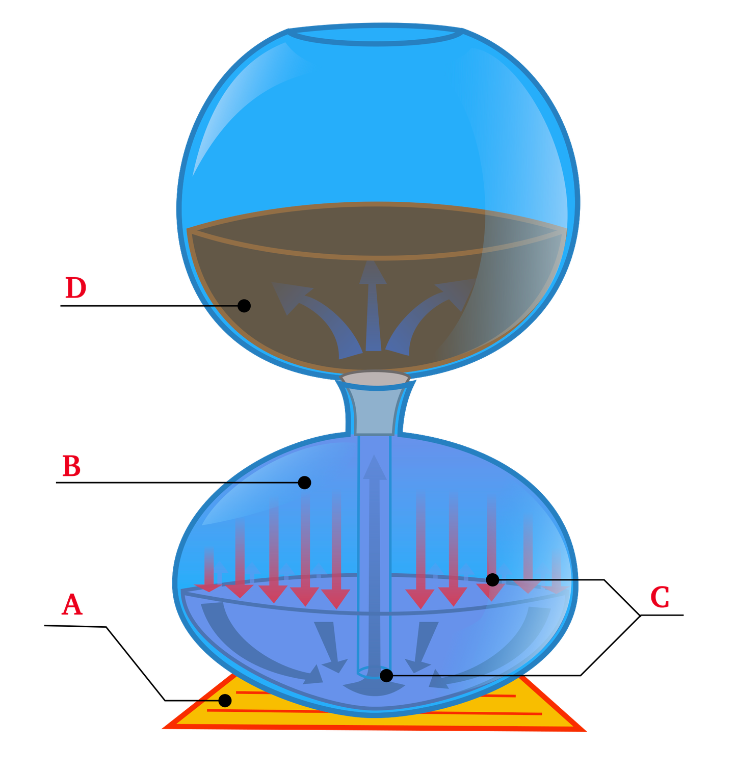 Điều này hoàn toàn không liên quan đến nguyên lý siphon nhé, hoàn toàn do áp suất hơi nước gây ra (tương tự như ấm Moka). Cũng cần nói thêm, khi áp suất tạo ra bởi hơi nước trong bình 1 cân bằng với áp suất khí quyển từ bình 2, ta có trạng thái chân không (cân bằng áp suất).