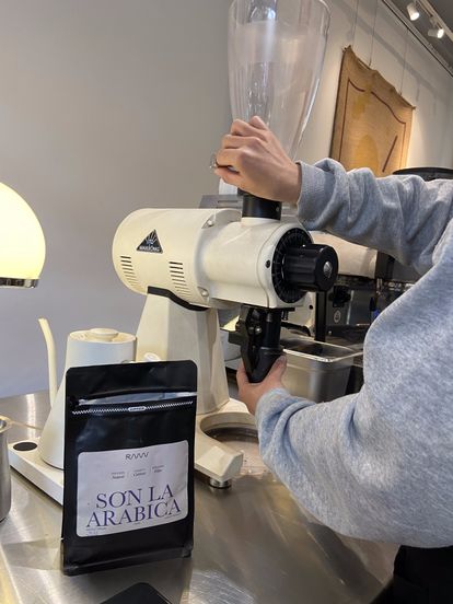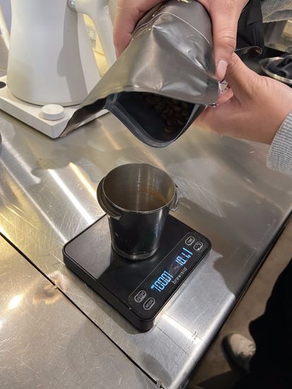 Ở đây chúng mình sẽ sử dụng 10gr cà phê Sơn La vì vậy lượng nước tương đương sẽ là 130gr nước (10:130)