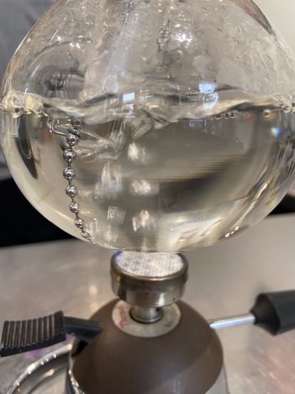 Hãy đặt siphon lúc đun nước giống như hình ảnh bên trên, chuỗi hạt của tim siphon có tác dụng đặc biệt giúp chúng ta biết thời điểm nước đạt đủ nhiệt độ. Việc rung động của tràng hạt là điểm báo: “hãy pha cà phê thôi nào!”