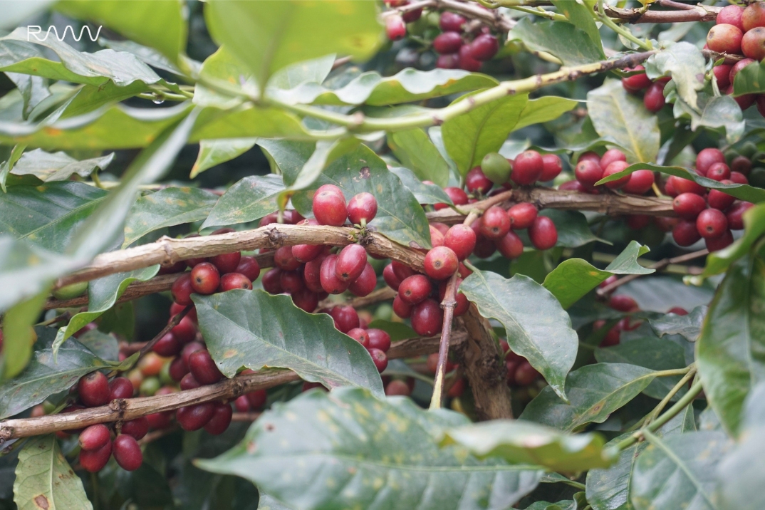 Những trái Catimor khỏe mạnh, đỏ thẫm trên những cành cà phê chắc khỏe. Tại đồi cà phê Chiềng Ban, nơi có độ cao cao khoảng 900m so với mực nước biển, những trái cà phê này được sinh trưởng trong điều kiện thời tiết lạnh hơn, giúp chúng có nhiều thời gian tích lũy chất dinh dưỡng và chín chậm hơn những đồi cà phê ở 100m thấp hơn.