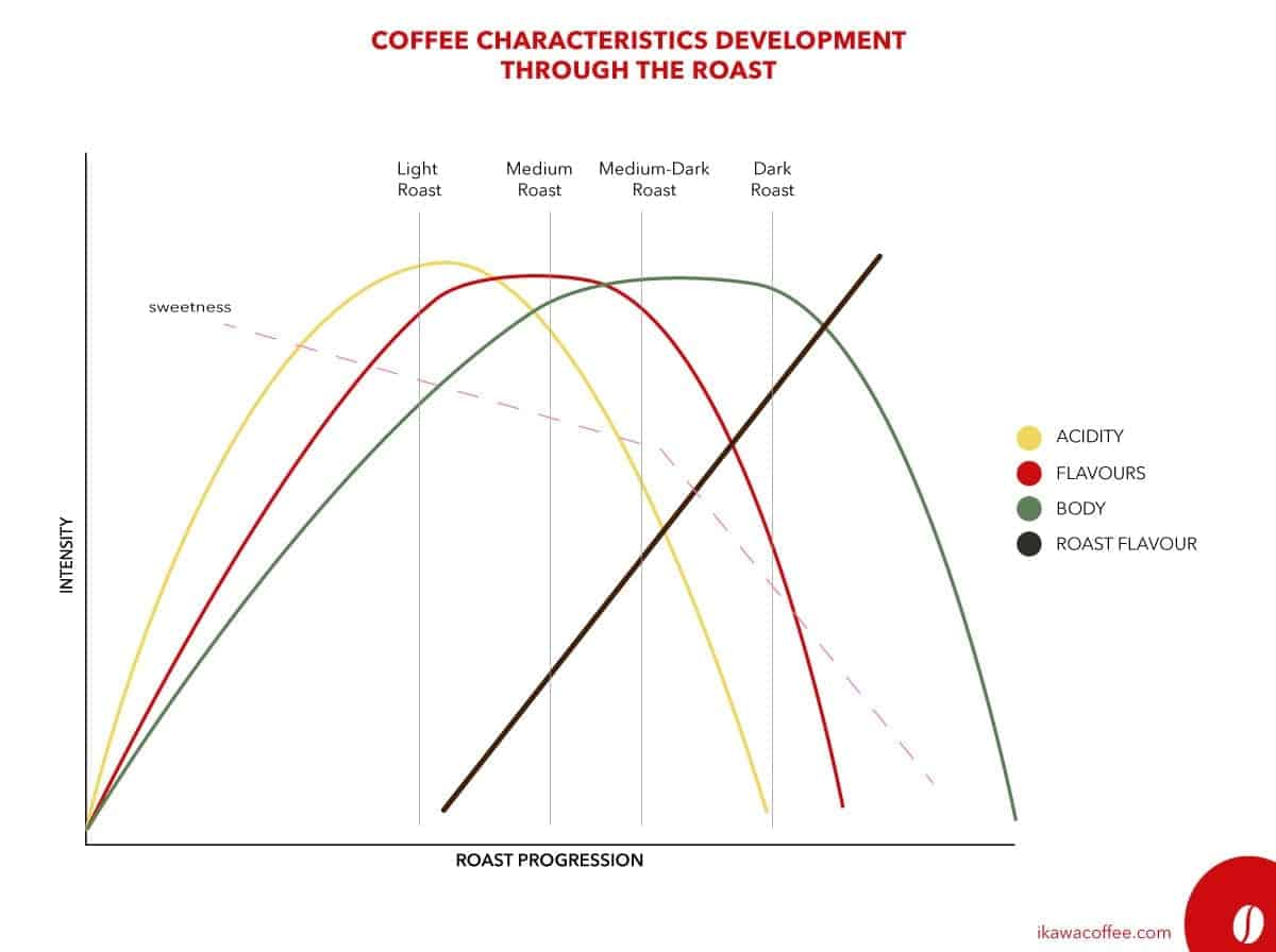 Như bạn đọc có thể thấy, mức độ ngọt của cà phê sẽ giảm dần theo thời gian và mức rang. Ở mức rang sáng (light roast), độ ngọt đang ở điểm cao nhất thế nhưng cùng lúc đó những vị chua cũng đang ở mức cao nhất. Bởi vậy bạn sẽ khó có thể cảm nhận được vị ngọt khi uống. Để dễ hình dung, bạn hãy tưởng mình đang có 2 cốc nước bỏ 1 lượng đường như nhau. Thế nhưng nếu một cốc bạn vắt chanh vào thì đảm bảo khi uống bạn sẽ thấy cốc đó chua hơn cốc còn lại. Đó là những thay đổi trong hương vị của cà phê trong quá trình rang.