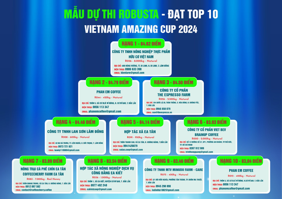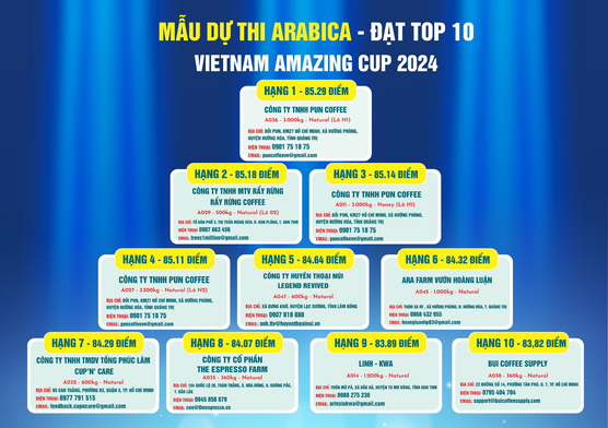 Thông qua cuộc thi, đội ngũ ban giám khảo sẽ chọn ra danh sách top 10 cho cà phê Arabica và top 10 cho cà phê Robusta, ngoài ra còn có những hạng mục như Arabica yêu thích nhất, hay Robusta yêu thích nhất.